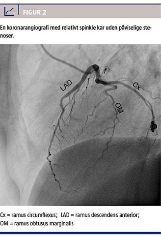 ST-depression (Figur 1). Paraklinisk var der et troponin-T-udslip på 593 ng/l (referenceværdi < 50 ng/l), hvorfor diagnosen non-ST-elevationsmyokardieinfarkt blev stillet. En ekkokardiografi viste let hypokinesi af den laterale del af venstre ventrikels forvæg, men samlet en normal uddrivningsfraktion på 60%. Dag 6 viste en koronarangiografi relativt spinkle kar uden angiografisk påviselige stenoser (Figur 2). Ved udskrivelsen var troponin-T-niveauet faldende, betablokkeren blev skiftet til propranolol 40 mg × 2, og hun blev frarådet al brug af triptaner. Tre måneder efter indlæggelsen var hendes troponin-T-niveau og ekg normaliseret, og migræneanfaldene var ophørt.