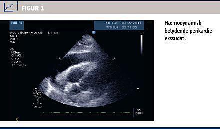 Syv uger senere blev patienten genindlagt med svær dyspnø, igen vigende EF og hæmodynamisk betydende perikardieekssudat (Figur 1), som udtømtes (i alt 900 ml). CRP-niveauet var på 190 mg/l. TnT-niveauet var normalt. Efter udskrivelsen blev patienten fulgt med ugentlige kontroller i den første måned, og man kunne konstatere nærnormalisering af EF.