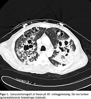 Efterforløbet var præget af respiratoriske komplikationer med bilateral pneumothorax. På dag 87 gik patienten ad mortem. På en computertomografi (CT) af cerebrum, thorax og abdomen foretaget under indlæggelsen sås bulløse og konso-liderende forandringer i begge lunger, ingen CT-påviselige abscesser i abdomen eller centralnervesystemet (Figur 1 ). Gentagne dyrkninger af blod, urin og trakealsekret gav ingen vækst af andre patogener. Hiv-test var negativ. Der blev ikke foretaget obduktion.