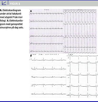 I et forsøg på at opnå frekvenskontrol blev der administreret 2 × 5 mg verapamil intravenøst med begrænset effekt på frekvensen, men patientens tilstand blev nu akut forværret med udvikling af cirkulatorisk svigt, systolisk blodtryk = 65 mmHg. Først på dette tidspunkt blev der gennemført bedside -ekkokardiografi, der viste en dilateret venstre ventrikel med uddrivningsfraktion på 10%. Patienten blev overført til et hjertecenter, hvor der blev gjort forsøg på akut DC-konvertering, men anæstesiinduktionen medførte komplet tab af cirkulation. Trods øjeblikkelig hjerte-lunge-redning kunne der ikke opnås spontan cirkulation, og ultimativt måtte patienten håndteres med extracorporal membrane oxygenation (ECMO)-behandling. Den dårlige pumpefunktion og takykardien persisterede i de følgende dage, og på dag to blev der gennemført subakut elektrofysiologisk undersøgelse, hvorved der blev afsløret et ektopisk arytmisubstrat i højre atrium. Radiofrekvensablation af dette substrat medførte øjeblikkelig ophør af takykardien, der blev afløst af underliggende nodalrytme. Efterfølgende forbedredes venstre ventrikel-funktion dagligt. På dag fem seponeredes ECMO-behandlingen, og på dag seks sås genetableret sinusrytme, og der blev påbegyndt peroral hjertesvigtsbehandling. Patienten blev udskrevet på dag 24 med intakt kognitiv funktion og havde på opgørelsestidspunktet normaliseret hjertefunktion, ingen symptomer på hjertesvigt, og han havde genoptaget sit fuldtidsarbejde.
