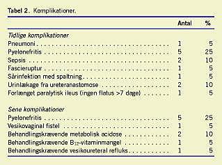 Indlæggelsestiden inklusive genindlæggelse inden for de første 30 postoperative dage var i gennemsnit 17,0 dage. Ti ud af 20 patienter havde til sammen 13 tidlige komplikationer i form af pneumoni, pyelonefritis, sepsis, forlænget paralytisk ileus, fascieruptur, sårinfektion med spaltning og urinlækage fra ureteranastomose med anlæggelse af nefrostomi (Tabel 2 ).