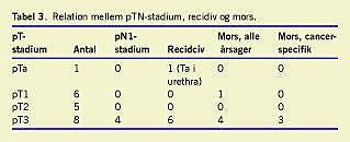 Tabel 3 viser patienternes TNM-stadium, recidiv og mors i opfølgningsperioden. pT-stadium varierede fra Ta-T3b. Fem patienter døde i opfølgningsperioden, heraf tre patienter af kendt metastatisk blærecancer, og disse patienter havde alle en pT3-tumor på operationstidspunktet. En patient døde af metastatisk mammacancer. En patient, som på operationstidspunktet havde en pT3N1-blæretumor, døde af ukendt årsag få måneder efter operationen. Fire patienter havde mod forventning lymfeknudemetastaser på operationstidspunktet, og alle fik recidiv i opfølgningsperioden. Femten patienter var i live efter endt opfølgningsperiode, og heraf var 12 patienter uden tegn på recidiv. Den gennemsnitlige opfølgningsperiode for de 12 patienter uden recidiv var 3,3 (spændvidde: 0,4-7,2) år.