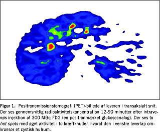 De fleste kræftknuder har øget optagelse af sukker og optager derfor mere 18 F-deoxy-glukose (FDG) end det omgivende væv. Efter injektion af FDG kan kræftknuder derfor ses som områder med øget radioaktivitet (hot spots) (Figur 1). PET er en yderst sensitiv metode til detektion af kræftknuder ned til få ml. Lokalisationen af kræftknuden kan imidlertid ikke fastlægges med særlig stor præcision, og det er derfor et fantastisk teknologisk fremskridt, at man nu med kombineret PET/CT med stor præcision kan fastlægge den anatomiske lokalisation af en hot spot . FDG-PET/CT er især velegnet til fastlæggelse af lokal udbredelse, lokal- og fjern-metastaser samt monitorering af behandlingsrespons af kolorektale levermetastaser og kolangiokarcinom. PET ændrer den diagnostiske eller terapeutiske strategi hos 20-40% af patienter med levermetastaser. Kun to tredjedele af de hepatocellulære karcinomer (HCC) kan påvises med FDG-PET, fordi omsætningen af glukose i HCC ikke afviger ret meget fra omsætningen i de omgivende normale leverceller. Derimod er FDG-PET velegnet til detektion af ekstrahepatiske HCC-metastaser. Tracere rettet specifikt mod processer mod ændret genekspression i HCC synes at være lovende, men er endnu på eksperimentelt stadie.