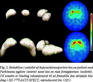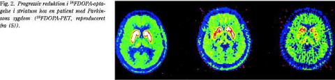 Hos patienter med tidlig IPD findes nær normal 18 F-DOPA-optagelse i nucleus caudatus, men nedsat optagelse særligt i de posteriore dele af putamen (Fig. 2). Dette karakteristiske billede muliggør en komplet distinktion mellem raske forsøgspersoner og patienter med tidlig IPD (6). Ved hjælp af 18 F-DOPA-PET-undersøgelser er det endvidere sandsynliggjort, at omkring 30% af de striatale dopaminerge neuroner skal være gået til grunde, før de første kliniske symptomer viser sig. Det årlige procentuelle tab af striatale dopamintransportere ved tidlig IPD er anslået til at udgøre omkring 12-13%, hvorimod tallene for raske aldersmatchede personer blot ligger på omkring 2% (7), og andre undersøgelser af normale ældre har påvist endnu mindre alderseffekt med typiske tab på 7-10% per dekade (8), hvilket i øvrigt er tæt på det tab, der ses for andre receptorsystemer. Antager man, at der er en lineær sammenhæng mellem tab i enten FDOPA-optagelse i putamen eller dopamintransportermængden i striatum og sygdomsvarighed, kan man beregne, at den prækliniske, asymptomatiske periode, før klinisk manifest IPD viser sig, har en latensperiode på omkring fem år (9). Der er dog visse holdepunkter for, at sygdomsprogressionen hos det enkelte individ relaterer sig til det initiale antal af striatale dopamintransportere.
