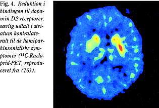 Der er ud fra såvel postmortale undersøgelser som funktionel billeddannelse holdepunkt for, at striatale dopamin D2-receptorer opreguleres tidligt i IPD, formentligt som et udtryk for kompensation for den dopaminerge denervering (12) (Fig. 4). Denne opregulering er dog ikke et lige konsistent fund i alle studier og er muligvis overvejende et tidligt forekommende fænomen (17). Ved fremskreden IPD findes der også signifikante tab af D2/D3-receptorbindingen ekstrastriatalt (16). Det har været hævdet, at D2/D3-bindingen især egner sig til at forudsige responset på dopaminerg medicinsk behandling (12).