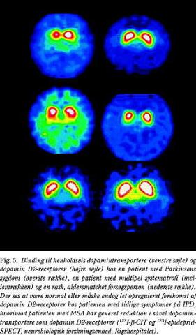 MSA, også kaldet Shy-Dragers syndrom, er en sygdom, der primært er karakteriseret ved rigiditet, ataksi og autonome forstyrrelser. Det er påvist, at omkring 10% af de patienter, der oprindeligt blev antaget at have IPD, ved neuropatologiske undersøgelser i stedet viste sig at have haft MSA. Eftersom ca. halvdelen af patienter med MSA udviser bedring under levodopa-behandling, kan manglende behandlingsrespons ikke anvendes som markør for diagnosen. Ved MSA findes reduceret D2/D3-binding hos omkring 63% (22) (Fig. 5), hvorimod 18 F-DOPA-PET synes at være mindre egnet til at skelne MSA fra IPD (23).