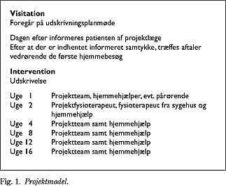 Projektmodellen (Fig. 1) omfattede en træningsperiode på 16 uger, inden for hvilken der var planlagt i alt seks besøg i hjemmet af projektteamet. Den faste hjemmehjælp skulle være til stede ved alle besøg. Cirka en uge efter udskrivelsen skulle den fysioterapeut, der havde trænet den ældre på sygehuset, ligeledes deltage i hjemmebesøget.