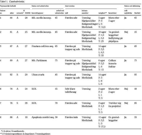 Som det fremgår af Tabel 1, var der kun kvinder med i undersøgelsen. Deres gennemsnitsalder var 83 år, og de var præget af multipatologi med mindst tre forskellige symptomgivende diagnoser. For overskuelighedens skyld er de ældre i Tabel 1 kun karakteriseret ved den diagnose, som blev regnet for den væsentligste årsag til funktionsnedsættelsen. Blandt de øvrige diagnoser var hypertension, osteoporose, kronisk venøs insufficiens og artrose nogle af de hyppigste.