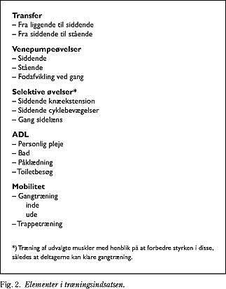 Elementerne i træningen er skitseret i Fig. 2. Selv om de ældres mål for træningen var de samme, var det vidt forskellig træningsforløb, der førte til målet. Hos tre deltagere (patient nr. 3, 4, 5) blev der fra starten lagt ud med gangtræning suppleret med selektiv træning. Patient nr. 1, 2 og 8 var derimod så svækkede ved udskrivelsen, at det var påkrævet at starte med træning af ADL-funktioner som grundlag for en efterfølgende gangtræning.
