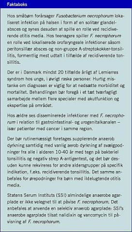 André Lemierre introducerede i 1936 begrebet anaerob postanginal septikæmi om disseminerede Fusobacterium necrophorum-infektioner, der udgik fra oropharynx [1]. Siden 1980'erne er betegnelsen Lemierres syndrom blevet brugt om metastaserende F. necrophorum-infektioner med primært fokus i hoved-hals-regionen. Gennem de seneste år er det dokumenteret, at F. necrophorum også kan give anledning til et spektrum af lokaliserede infektioner, især i hoved-hals-regionen.