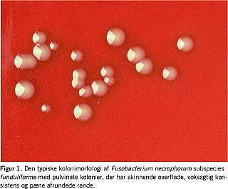 Statens Seruminstituts (SSI) almindelige anaerobe chokoladeplade er ikke velegnet til at finde F. necrophorum, der er relativt langsomtvoksende og derfor let bliver overgroet af andre bakterier i prøvemateriale fra slimhinder. En selektiv anaerob agarplade, f.eks. SSI's anaerobe agarplade, tilsat nalidixin 5,0 mg/l og vancomycin 2,5 mg/l, og inkuberet anaerobt i 10% CO2 og 10% brint i op til fire dage, er derimod god til at finde vækst af F. necrophorum [10]. Den typiske kolonimorfologi er vist i Figur 1. En tidlig mistanke om F. necrophorum subspecies funduliforme fås ud fra det karakteristiske mikroskopifund i gramfarvning. Her ses kokkoide/pleomorfe stave, der ikke er fusiforme (tenformede), men ligger i tråde og nøgler (Figur 2). Mistanken om F. necrophorum bør straks videregives til klinikerne. Hvis der »kun« meddeles, at der er fundet »vækst af anaerobe gramnegative bakterier« i f.eks. bloddyrkning uden fremhævelse af den karakteristiske pleomorfe morfologi i mikroskopien, kan klinikerne forledes til at søge efter et abdominalt focus, ikke mindst da en del patienter med klassisk Lemierres syndrom har abdominale smerter [9]. Gennem nogle få supplerende test kan en endelig identifikation foreligge inden for tre dage [10]. En daglig polymerasekædereaktion (PCR)-analyse er selvfølgelig hurtigere, men er forholdsvis dyr og giver ikke antibiotikafølsomheden. F. necrophorum er normalt fuldt følsom for penicillin, metronidazol og clindamycin. Penicillinresistens ses dog, men er sjælden.