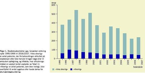 Antallet af skadestuekontakter pga. fyrværkeri i nytårsdøgnene 31. december og 1. januar er de seneste 12 nytår blevet halveret. Endvidere er antallet af kontakter, der i 2006/2007 var forårsaget af ulovligt fyrværkeri, kun 10% af antallet i 1996/1997. Da de ulovlige fyrværkerityper i større grad end de lovlige medfører alvorlige læsioner, har nedgangen i sig selv nedbragt den samlede alvorlighed. Ser man alene på de alvorlige læsioner, er det største problem p.t. det lovlige fyrværkeri, dog med det forbehold, at dødsfald - med undtagelse af et enkelt ulykkeligt tilfælde af ikke korrekt anvendelse af lov- ligt fyrværkeri - alene er forbundet med brug af ulovligt fyrværkeri.
