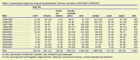 Materiale og metoder: Siden 1995/1996 har man på landets skadestuer og skadeklinikker registreret skadestuekontakter, hvor fyrværkeri har været årsag til ulykken. Denne indsamling og endelig registrering af sygehus, køn, alder, fyrværkeritype, diagnose(r) og afslutningsmåde er koordineret af Ulykkes Analyse Gruppen ved Ortopædkirurgisk Afdeling, Odense Universitetshospital. Der er sikret 100% besvarelse i hele perioden. I alt indgår der 4.447 fyrværkeriskader.
