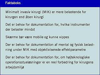 Minimalt invasiv kirurgi (MIK) er i teorien mere fysisk og mentalt krævende at udføre end konventionel åben kirurgi. Dette hænger sammen med MIK's indbyggede begrænsninger. Dokumentationen for implementering af højteknologiske operationsstuer og designudvikling af instrumenter mhp. at forbedre ergonomien i kirurgens arbejde er sparsom på området, ligesom det i bredere forstand er udokumenteret, om der foreligger et egentligt problem. Der er behov for klinisk forskning med etablering af en metodologisk model, der afdækker ergonomiske problemstillinger ved MIK.