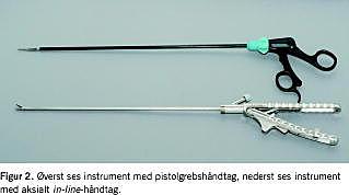 Der eksisterer en række forskellige håndtag på markedet, hvoraf de hyppigst anvendte er det aksiale, in-line -håndtag og pistolgrebshåndtaget (Figur 2 ). Der er ikke klare rekommandationer for hvilke, der er bedst mht. brugertilfredshed og reduktion af fysiske parametre som ekstrem fleksion-ekstension og ulnar-radial deviation samt muskelaktivitet [11, 12]. Statiske åbne-lukke-kontraktioner kræver mere muskelaktivitet end instrumenter fra åben kirurgi, omvendt er der ikke påvist en markant forskel i udførelse af forskellige opgaver med de to typer instrumenter [10, 13]. Aktiviteten varierer dog meget i de enkelte muskler i underarmen ved håndtering af forskellige typer af håndtag under både statiske og dynamiske kontraktioner [10, 13-16]. Konklusionen er, at muskelbelastningen er uspecifik for opgaven og afhænger af håndtagets udformning, og at der endnu ikke er retningslinjer for en ideel type [16].