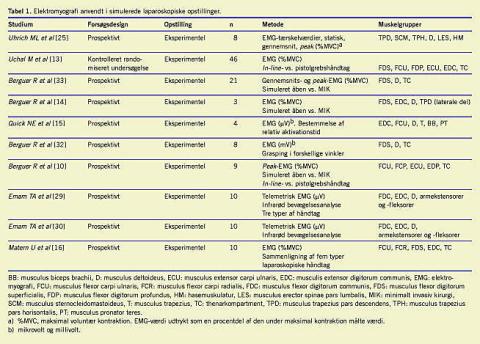 I et prospektivt studium (n = 8) påviste man efter repetitive opgaver overskridelser af standard peak -percentiler for statisk arbejde i musculus trapezius og deltoideus [25]. De øvrige studier har påvist større muskelaktivitet målt med EMG ved håndteringen af laparoskopiske instrumenter end med instrumenter anvendt i et åbent design. Udslaget på EMG'et afhang primært af det laparoskopiske instruments ergonomiske udformning, hvorfor det var svært at sammenligne med den åbne tilgang.