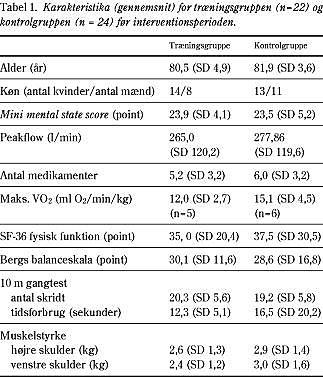 Materiale og metoder: I et randomiseret, kontrolleret interventionsstudie deltog 46 hjemmeboende, svage ældre patienter (>74 år). Interventionsgruppen modtog »multikomponenttræning«, mens kontrolgruppen ikke blev aktiveret. Fysisk funktionsevne blev bestemt gennem SF-36, Bergs balanceskala, 10 m gangtest og muskelstyrketest.