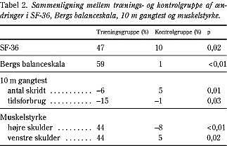 Resultater: Der fandtes signifikant forbedring i funktionsevnen bestemt ved Bergs balanceskala, gangtest, muskelstyrketest og SF-36 (p<0,01). De gennemsnitlige omkostninger per patient blev beregnet til 121 kr. per træningstime svarende til 1.452 kr. for et 12-ugers forløb.