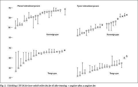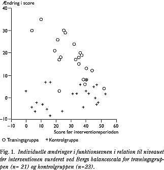 Ved sammenligning med kontrolgruppen fandtes der i testgruppen en signifkant fo rbedring af funktionsevnen vurderet ved Bergs balanceskala, SF-36, 10 m gangtest og muskelstyrke (Tabel 2 ). I Fig. 1 præsenteres de enkelte patienters forbedring af funktionen vurderet på Bergs balanceskala i relation til deres niveau før interventionsperioden. De individuelle ændringer i den mentale og den fysiske komponent af SF-36 fremgår af Fig. 2 .