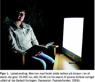 Hypomani kan ses, mens egentlig mani er yderst sjælden. Det er vigtigt at anvende lamper med afskærmede lyskilder for at bremse UV-strålingen, som er skadelig for retina. Patienter med øjensygdomme bør konsultere en øjenlæge. Det anbefales at anvende den størst mulige lysskærm for derigennem at overstråle større dele af retina, og lysstyrken bør være 10.000 lux i 30-40 cm's afstand (Figur 1 ). Lysbehandlingstiden er på 30-60 minutter. Den bedste effekt ses ved behandling om morgenen. Lys kan også anvendes resten af dagen, dog ikke om aftenen, idet der så kan forekomme indsovningsbesvær. Patienterne bør orienteres om, at man absolut ikke skal anvende solarielys, og at lysbehandling af depression sker fra specielt indrettede lamper til dette brug, samt at lyset virker gennem øjnene, ikke gennem huden. Naturligt lys, f.eks. ved en gåtur på 30-60 minutter, er også effektivt. Selv på regnvejrs- og gråvejrsdage er der meget mere lys ude (minimum 3.000 lux) end inde (maksimum 500 lux), selv hvis man sidder i et veloplyst kontormiljø. Computer og fjernsyn er ikke nogen substitut for lysbehandling! Lysvejledning kan hentes på www.psykforskhil.dk og inspiration og viden om lysbehandling på www.sltbr.org. Sidstnævnte website laves af et uafhængigt selskab for anvendelsen af lysbehandling.