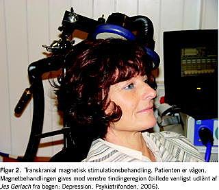 Transkranial magnetisk stimulation (TMS) er en nyere metode, hvor man anvender impulstog (kaldet repetitiv TMS (rTMS)) af kraftige og fokuserede magnetiske impulser rettet mod den præfrontale hjernebark til behandling af depression. Anvendelsen stammer fra neurologien, hvor TMS bruges til bestemmelse af nerveledningshastighed eller kortlægning af kortikale funktioner. TMS-apparaturet danner ved hjælp af generatorer et hurtigt magnetisk flux, som udløses fra en håndfladestor spole, som oftest appliceres på venstre tindingeregion (rettet mod den venstre præfrontale cortex) (Figur 2 ). Den hurtige ændring i magnetfeltet bevirker generering af en svag elektrisk strøm i cortex. Applikationen fremkalder ofte lettere muskeltrækninger omkring applikationsstedet, og den hyppigste bivirkning er hovedpine. Patienterne er vågne under behandlingen, som typisk varer 20-30 minutter.
