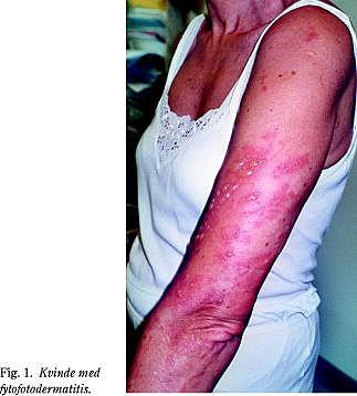 Fytofotodermatit er en toksisk plante-sol-induceret dermatit. Dermatitten opstår i hud, der har været i kontakt med fotosensibiliserende plantestoffer og derefter er blevet udsat for sollys (1). Diagnosen stilles som regel på baggrund af sygehistorien og de karakteristiske polymorfe hudlæsioner i form af erytem, vesikler og evt. bullae, der opstår kort tid efter lyseksponeringen. Fytofotodermatit heler med efterfølgende hyperpigmentering af huden.