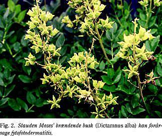 Summary Phytophotodermatitis caused by Dictamnus alba. Ugeskr Læger 2003;165:2400-1. The most well-known cause of phytophotodermatitis in Denmark is accidental contact with plants belonging to the Apiaceae (Umbelliferae), such as hodgweed (Heracleum spondylium). However, many other plants with furocoumarins (psoralens) may induce the same kind of reaction. We describe a case of phytophotodermatitis caused by Dictamnus alba, gas plant or burning bush also known from the Bible as the "burning bush of Moses".