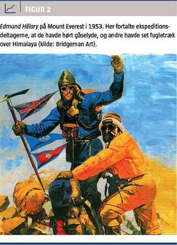 »Hånk, hånk« sagde gasen Anser. »Hånk«, sagde gåsen Eulabeia. De to stribehovedede grågæs forberedte deres lange rejse hjem til jul. Vi ved fra Nils Holgersens rejse gennem Sverige, at gåsen Akka fra Kebnekaise var en habil flyver (Figur 1). Sveriges højeste bjerg, Kebnekaise i Lapland, er med dets godt to kilometer imidlertid det rene vand i forhold til det, der venter Anser og Eulabeia, der forbereder deres rejse over Himalayamassivet. Dette træk tager dem på en flyvetur op til 7-9 kilometers højde, hurtigere og højere end nogen anden fugl eller pattedyr kan overleve, og det endda med udfoldelse af fuld muskelkraft [1]. Da Edmund Hillary i 1953 betvang Mount Everest, havde ekspeditionen datidens termotøj på og var udstyret med ansigtsiltmasker, der sikrede den ilt, der var nødvendig for det krævende fysiske arbejde (Figur 2). Hvorledes kan Anser og Eulabeia klare denne tur uden hjælpemidler? – og så for at komme hjem til jul. Vi vil se på, hvorledes disse gæs gør kunststykket, for det gør de til fysiologiens og alles store undren i den yderst tynde luft.