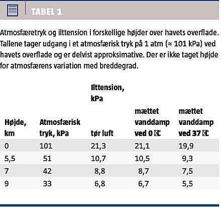 Trykket i atmosfæren aftager eksponentielt fra jordens overflade. Halveringsafstanden er omkring 5,5 kilometer, hvilket betyder, at atmosfæretrykket i en højde på 5,5 kilometer er omkring halvdelen af trykket ved havoverfladen, og det er en fjerdedel i 11 kilometers højde. I Tabel 1 ses de korresponderende værdier af ilttension i den atmosfæriske luft. I 7-9 kilometers højde er ilttensionen i indåndingsluften reduceret til en tredjedel.