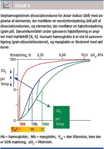 Legemstemperaturen hos gæs i hvile er fysiologisk 41-42° C [8]. Under ekstreme forhold, hvor det samlede stofskifte stiger til mere end ti gange hvilestofskiftet, må det formodes, at temperaturen i de arbejdende muskler er 45° C eller måske mere (selvom det aldring er direkte målt). Dette medfører nu en betragtelig højreforskydning af dissociationskurven, hvilket indebærer, at blodet lettere afgiver ilt til muskelcellerne, og at ilttensionen i vævet ikke bliver så lav, som den ellers ville være blevet ved en tilsvarende iltafgivelse uden højreforskydning. Evnen til at arbejde i et temmelig surt miljø er kendt fra krybdyr og neddykkede pattedyr og fugle. Forbrænding af fedtstoffer og ketonstoffer medvirker formentlig også til en sådan surgørelse og øget kuldioxidtension, der via Bohreffekten letter iltafgivelsen til vævene.