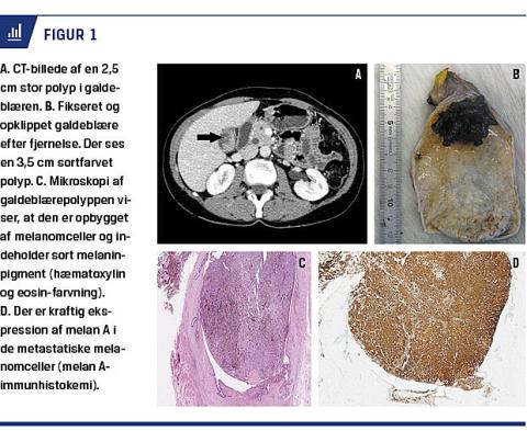 En 52-årig kvinde blev henvist til videreudredning/behandling, idet en CT-skanning udført på grund af træthed, sure opstød, øvre mavesmerter og et ufrivilligt vægttab (halvandet kg på en uge) havde vist en 2,5 cm stor polypøs forandring i galdeblæren (Figur 1A). Patienten var ellers rask, fraset at hun otte år tidligere havde fået fjernet et superficielt spredende malignt melanom (Clarks level IV med en tykkelse på 1,19 mm) på ryggen. Opfølgningen var blevet afsluttet efter fem år. På mistanke om galdeblærecancer planlagde man laparoskopi inklusive laparoskopisk ultralydskanning og eventuel samtidig kolecystektomi samt fjernelse af lymfeknuder i det hepatoduodenale ligament. Ved opera-tionen fandt man ved laparoskopisk ultralydskanning tre 5 mm store malignitetssuspekte områder i leveren, og frysemikroskopi gav mistanke om metastase fra et malignt melanom. Polyppen i galdeblæren voksede ikke ned i leveren, hvorfor der blev foretaget åben kolecystektomi med deling af ductus cysticus helt tæt på ductus choledochus (inklusive frysemikroskopi af resektionsranden) samt fjernelse af de lokale lymfeknuder som planlagt. Det postoperative forløb var uden komplikationer. Makroskopisk var polyppen i galdeblæren sortfarvet og havde en diameter på 3,5 cm