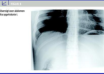 I. En 28-årig mand, som et år tidligere har fået foretaget laparoskopisk gastrisk bypass, blev indlagt akut. Han har i fire dage haft kvalme, opkastningsfornemmelser og intermitterende abdominale smerter. Ved indlæggelsen var der konstante smerter, som var lokaliseret til øvre abdomen. I hele perioden var der normal tarmfunktion. Abdomen var spændt og øm, men uden peritoneal reaktion. Oversigt over abdomen tolkedes primært som normalt (Figur 1 ). Kontrastindgift viste fri og hurtig passage af kontrasten. Patientens tilstand forværredes den følgende time med tiltagende smerter, takykardi og påskyndet respiration. Der var normalt blodtryk, og temperaturen måltes til 35,1 °C (aksiltemperatur). Der foretoges derefter akut operation med fund af svært dilateret ventrikel, flere liter blakket væske intraperitonealt, som kom fra den udshuntede del af ventriklen, hvor der er opstået lækage ved stapler- rækken på grund af en stenose i det ileopankreatiske ben ved jejunojejunostomien. Der anlagdes en gastrostomi, og et stenotisk jejunumstykke på fem cm recesseredes, og afslutningsvis anlagdes der en ny jejunojejunostomi. Der blev givet firestof-antibiotika for sepsistilstanden, og de første dage var patienten på intensiv afdeling. Patienten rettede sig hurtigt, og det postoperative forløb herefter var ukompliceret. Gastrostomisonden seponeredes efter fire uger.