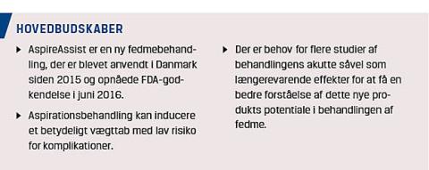I Sverige anses metoden som et alternativ til den patientgruppe, der ikke vil/kan behandles med fedmekirurgi. AspireAssist har opnået godkendelse af den amerikanske Food and Drug Administration (FDA) i juni 2016. Behandlingen er dog kontroversiel og har allerede afstedkommet en del debat i videnskabelige og kliniske fora såvel som i pressen. Vi vil i denne artikel beskrive denne fedmebehandling og give et overblik over den eksisterende litteratur på området.