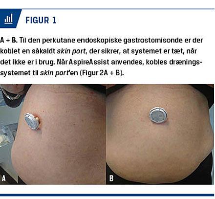 Ved aspirationsbehandling med AspireAssist får overvægtige patienter anlagt en perkutan endoskopisk gastrostomi (PEG)-sonde i ventriklen under gastroskopi og en såkaldt skin port kobles til PEG-sondens udgang (Figur 1). Hele proceduren tager typisk ca. 15 minutter at udføre, og patienten kan komme hjem samme dag. Ca. 20 minutter efter indtagelse af et måltid tilkobles det eksterne dræningssystem (Figur 2). Patienten kan derefter tømme ventriklens indhold postprandialt ved at åbne for systemet og skylle med postevand ind i ventriklen til der ikke længere er madrester i aspiratet. Herved skylles ca. 30% af kalorierne i det indtagne måltid ud i toilettet og optages derfor ikke, hvilket på længere sigt fører til et vægttab [10].