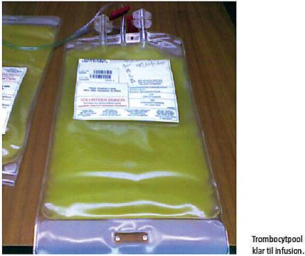 Efter en uge fik patienten pludselig voldsom rektalblødning. Ticagrelor og ASA blev pauseret. En akut foretaget gastroskopi viste normale forhold i ventriklen og indtil duodenums andet stykke. Man afstod umiddelbart fra koloskopi og skintigrafi pga. patientens tilstand og det sandsynlige i, at blødningen var lokaliseret til den nedre gastrointestinal (GI)-kanal. Det følgende døgn fik patienten syv portioner SAG-M, seks portioner friskfrosset plasma (FFP) og to portioner albumin. Albumin blev givet for at modvirke hypovolæmisk shock. Der blev ikke givet trombocytter ved blødningsstart, da patienten var påvirket af ticagrelor, og elimination heraf blev prioriteret højere. Blødningen aftog ikke. Biokemi viste følgende niveauer: Hgb 5,0 mmol/l, trombocytter 188 × 109/l (referenceniveau: 165-400), D-dimer 0,4 mg/l (referenceniveau: < 0,3), aktiveret partiel tromboplastintid var 32 s (referenceniveau: 25-40), international normalized ratio 1,1, antitrombin 0,85 kIE/l (referenceniveau: 0,85-1,3) og fibrinogen 7,7 mikromol/l (referenceniveau: 5-12). Der blev givet fibrinogen trods normal P-fibrinogen, da denne var faldet fra 13 til 7,7 mikromol/l på et døgn. Patienten havde et middelblodtryk på ca. 80 mmHg trods transfusionerne.