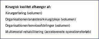 Der har været betydelig fokus på behandlingsresultaterne for kolorektal cancer, primært på grund af at prognosen er dårligere i Danmark end i de øvrige nordiske lande. En medvirkende årsag er, at 30-dages-mortaliteten efter kirurgi er højere i Danmark end i Sverige (elektiv operation ca. 7% hhv. 2,5%, akut operation ca. 23% hhv. 10%) [4, 5].