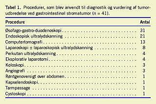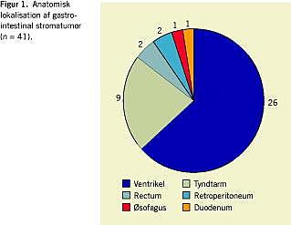 Resultater: Man fandt 41 patienter med GIST (25 mænd og 16 kvinder, medianalder 62 år). De hyppigste symptomer, som førte til diagnosen, var øvre gastrointestinal blødning og abdominalsmerter, og hovedparten af GIST udgik fra ventriklen (63%) eller tyndtarmen (22%). 95% fik foretaget kirurgisk resektion af tumoren med frie resektionsrande, mens resektion ikke var mulig hos to patienter. Bedømt på tumorstørrelse og mitoseindeks tilhørte 69% af patienterne lav- eller intermediærrisikogruppen for udvikling af metastaserende sygdom. Knap en fjerdedel af patienterne fik medicinsk behandling med tyrosinkinasehæmmer.