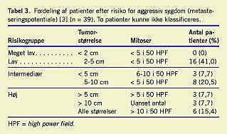 Ud fra tumorstørrelse og mitoseindeks blev patienterne opdelt i risikogrupper [3] (metastaseringspotentiale) (Tabel 3). Ti (24%) patienter fik imatinibbehandling; seks af dem blev behandlet på grund af recidiv. Tre patienter, som primært havde lokalt nonresektable tumorer, blev imatinibbehandlet, og efterfølgende kunne to opereres radikalt. En patient var medicinsk inoperabel og fik kortvarig imatinibbehandling. Af de imatinibbehandlede patienter var tre i live ved inklusionsperiodens ophør.