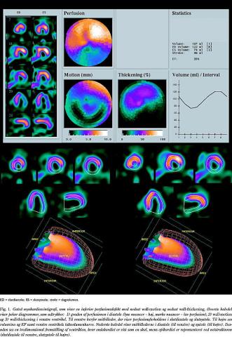 Det radioaktive sporstofs optagelse i myokardiet afspejler perfusionen på injektionstidspunktet. Perfusionsfordelingen kan efterfølgende erkendes visuelt ved hjælp af et tomograferende gammakamera. Ved at ekg-synkronisere optagelsen kan hver hjertecyklus opdeles i en række intervaller eller billeder (2, 3). Der udføres sædvanligvis en optagelse i hvile og en under arbejdsbelastning (ergometercykling) eller farmakologisk stress. Undersøgelsen viser perfusionsforholdene på injektionstidspunktet (hvile eller belastning) og pumpefunktion på optagelsestidspunktet (hvile eller »poststress«). Ud over den regionale perfusionsfordeling i venstre ventrikel kan vægbevægelserne erkendes visuelt. Den regionale systoliske pumpefunktion kan vurderes ud fra wall-motion (myokardievæggens bevægelser bedømt ud fra endokardiets bevægelser) og wall-thickening (fortykkelse af myokardievæggen i systolen, hvilket ses som en øgning af myokardiets intensitet). Ved at bestemme endokardiets kontur kan man måle slutsystolisk og slutdiastolisk volumen og dermed også slagvolumen (minutvolumen) og EF, der er et udtryk for den globale, systoliske pumpefunktion (Fig. 1 ).