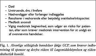 I direktivet præciseres, hvordan GCP skal udføres, og en række andre forhold, herunder at: 1) forsøgspersoner skal have et kontaktpunkt, hvorfra de kan opnå yderligere oplysninger, 2) der er skærpede krav til forsøg med mindreårige eller umyndiggjorte, 3) svarfristen ved anmeldelse til de videnskabsetiske komiteer er højst 60 dage, og der er kun en udtalelse pr. land i multicenterforsøg, 4) indsigelsesfristen er højst 60 dage fra den kompetente nationale myndighed (i Danmark Lægemiddelstyrelsen), 5) alle forsøg registreres i en europæisk database (EUDRACT), hvortil kun kompetente myndigheder, Det Europæiske Agentur for Lægemiddelvurdering og Kommissionen har adgang, 6) alle alvorlige utilsigtede hændelser (Fig. 1 ) indberettes af investigator til sponsor og herfra til Lægemiddelstyrelsen og videnskabs-etisk komité, Lægemiddelstyrelsen rapporterer disse til en europæisk database, 7) der aflægges årlig rapport fra sponsor til Lægemiddelstyrelsen og videnskabsetisk komité om alle alvorlige utilsigtede hændelser og forsøgspersonernes sikkerhed, 8) sponsor rapporterer afslutning af forsøg til Lægemiddelstyrelsen og videnskabsetisk komité, 9) fremstilling, mærkning og import af testpræparater følger good manufacturing practice (GMP), og 10) særregler for forsøg med genterapi, somatisk celleterapi, xenogen celleterapi eller lægemidler, som indeholder genmodificerede organismer, følges.