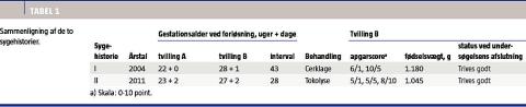 I. En 34-årig kvinde var blevet spontant gravid med dikoriske gemelli efter at have haft seks spontane aborter og født tre levende børn. Hun fik spontan vandafgang i uge 21 + 4 og fødte tre dage senere tvilling A, der døde kort efter fødslen. Der blev foretaget høj afnavling, og antibiotisk behandling med cefuroxim, metronidazol og erythromycin fortsatte i ti dage. I uge 23 + 4 valgte man i samråd med forældreparret at give betamethason til lungemodning og overflyttede kvinden til en tertiær afdeling, hvor man genoptog antibiotisk behandling. I uge 25 anlagde man cervikal cerklage på grund af blød og afkortet collum. Ved fulde 28 uger blev kvinden tilbageflyttet til et lokalsygehus. Næstfølgende dag fik hun tiltagende kontraktioner, og da caput stod dybt, og cerklagen var løs, blev den fjernet. Tvilling B fødtes vaginalt, fik apgarscore 6/1, 10/5 og vejede 1.180 g. Ved fireårsalderen havde barnet udviklet sig normalt.