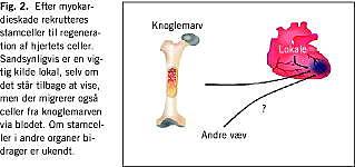 Det var som et blik ind i en anden verden, da en gruppe fra New York viste, at injektioner af knoglemarvsceller i randzonen af store, friske forvægsinfarkter hos mus førte til gendannet myokardievæv i 68% af det infarcerede område efter ni dage [12]. De injicerede celler, der kunne identificeres efter implantationen fordi de var mærkede med GFP3 , differentierede til alle myokardiets celletyper og dannede et nyt myokardium, inklusive myocytter, arterier, arterioler og kapillærer, der var funktionelt i den forstand at det forbedrede hjertets pumpefunktion. Disse spektakulære resultater hos mus er endnu ikke reproduceret, men differentiering af marvceller til hjertemuskelceller og kar efter akut myokardieinfarkt (AMI) har været observeret i andre eksperimenter med dyr [7].