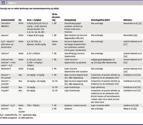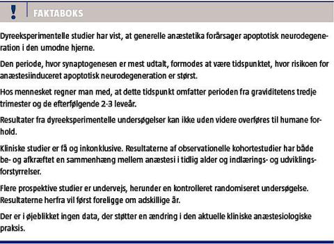 Det er veldokumenteret, at børn, som tidligt i barndommen eksponeres for kirurgi og anæstesi, har øget risiko for indlærings- og adfærdsvanskeligheder samt forsinket psykomotorisk udvikling [1-5]. Man mente længe, at det skyldtes forhold, der var relateret til selve operationen, grundsygdommen og/eller præmaturitet. Gennem de seneste 10-15 år er der opstået tvivl om, hvorvidt anæstesimidler kan være en bidragende årsag. Talrige dyreeksperimentelle studier har vist, at alle klinisk anvendte anæstesimidler ved induktion af neuroapoptose kan virke neurotoksiske på dyreungers umodne hjerner. Hypotesen er, at anæstetika administreret under synaptogenesen også hos mennesker kan medføre irreversibel skade på forbindelserne mellem neuronerne med neurokognitive sequelae til følge [6].
