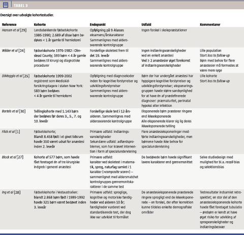 I et dansk kohortestudie undersøgte man 9.-klasses års- og eksamenskarakterer for en kohorte af alle danske børn, som i perioden 1986-1990 var blevet bedøvet i forbindelse med herniotomi i første leveår. Børnenes præstationer blev sammenlignet med en 5% stikprøve fra de samme fødselsårgange. Efter justering for konfoundere (f.eks. alder, køn, fødselsvægt, medfødte misdannelser samt forældrenes alder og uddannelse) fandt man ingen forskel i akademisk præstation blandt de to grupper. Andelen af hernieopererede børn, der ikke fik nogen 9.-klasses eksamen, var dog større end i kontrolgruppen [29]. I et hollandsk tvillingestudie fandt man ikke nogen sammenhæng imellem anæstesi i den tidlige barndom og ringe præstationer i skolen. Blandt 1.143 monozygote tvillingepar identificerede man de par, i hvilke den ene tvilling var blevet bedøvet i alderen 0-3 år og 3-12 år. Man gennemgik standardiserede test og skolelærernes vurdering af børnene i 12-års-alderen. De anæstesieksponerede tvillinger klarede sig markant dårligere end kontrolgruppen. Men blandt de tvillingepar, hvor den ene tvilling havde været eksponeret for kirurgi og anæstesi og den anden ikke, var der ingen forskel i de foretagne test børnene imellem. Dette studie indikerer, at der ingen sammenhæng er mellem tidlig anæstesieksponering og senere indlæringsvanskeligheder [30]. Udvalgte studier fremgår af Tabel 3.