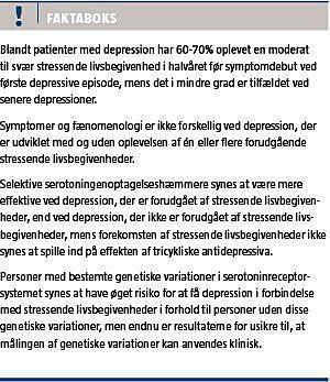 I en større europæisk undersøgelse med dansk deltagelse fandt man imidlertid, at den antidepressive effekt af escitalopram var større ved depression, der var forudgået af en stressende livsbegivenhed, end ved depression, der ikke var forudgået af en stressende livsbegivenhed, mens forekomsten af forudgående stressende livsbegivenheder ikke spillede ind på effekten af nortriptylin [12]. Disse fund ligger i forlængelse af tidligere danske resultater, som tydede på, at tricykliske antidepressiva (clomipramin) var mere effektive ved depression med melankoliforme karakteristika end selektive serotoningenoptagelseshæmmere (SSRI) (paroxetin [13]).