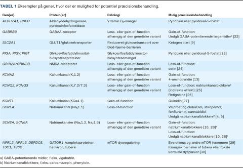 Dette gælder f.eks. for SLC2A1, der koder for glukosetransporteren (GLUT1) i blod-hjerne-barrieren [9]. Patogene varianter i dette gen fører til reduceret glukosetilførsel til hjernen og derved udviklingshæmning og epilepsi [9]. Kendskab til genfejlen muliggør præcisionsbehandling i form af ketogen diæt, idet diæten medfører, at kroppens, inklusive hjernens, primære energikilde bliver ketoner (fra fedtsyremetabolisme) fremfor glukose [9]. En sådan direkte sammenhæng mellem en gendefekt og behandling eksisterer endnu kun få gener (Tabel 1). Nyere forskning har dog ført os tættere på målrettet behandling for mange monogene epilepsier. Nedenfor gennemgås nogle af disse muligheder.
