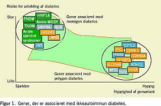 Den omfattende og hurtige udvikling i genteknologi og den første kortlægning af den samlede menneskelige arvemasse (det humane genom) har medført en eksplosion i vores viden om den komplekse arvelighed ved almindelig type 2-diabetes (T2D). Indtil 2007 var der kun påvist tre genetiske regioner, der med sikkerhed var associeret med T2D. Variationer i generne der koder for PPARG og KCNJ11 var identificeret ved hjælp af den såkaldte kandidatgenmetode, hvor biologisk viden dannede grundlaget for en genetisk undersøgelse af de to gener. Familiestudier med kobling til en bestemt region på kromosom 10 førte i 2006 til identifikation af TCF7L2 som det hidtil vigtigste gen for T2D. I 2007 er der identificeret yderligere otte validerede T2D-genregioner, så vi i alt nu kender til 11 validerede T2D-gener [2]. Seks af de otte genregioner, der er identificeret i 2007 blev fundet ved hjælp af »hel-genom-associationsstudier«, hvor frekvensen af ca. 500.000 hyppigt forekommende enkeltgenvariationer (single nucleotide polymorphisms (SNPs)) sammenlignes mellem flere tusinde T2D-patienter og lige så mange ikkediabetiske kontrolpersoner. Efterfølgende er de bedst associerede SNPs fra »hel-genom-associationsstudiet« valideret i endnu større case-kontrol-studier. De validerede hyppigt forekommende T2D-associerede genvarianter medfører for den enkelte person en kun beskeden øgning i risikoen for T2D (Figur 1). De pågældende genændringer er således ikke sygdomsspecifikke, men alligevel sygdomsfremkaldende, når de forekommer i en uheldig kombination og i et samspil med bestemte livsstilsfaktorer, som ofte er for lidt fysisk aktivitet og/eller for megen mad. De nøjagtige mekanismer, hvorved de beskrevne T2D-genvarianter medfører en øget risiko for T2D, er ikke kendt i detaljer, men nyere genetisk-epidemiologiske data tyder på, at de hyppigt har en effekt på betacellens evne til at secernere insulin. Viden om genetikken ved T2D kan endnu ikke anvendes til individualiseret forebyggelse eller behandling.