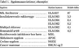 Perspektiverne for dette forskningsområde blev udvidet meget betydeligt, da man i løbet af 1970'erne fandt, at en række forskellige sygdomme med kompleks arvegang fortrinsvis opstår hos personer, der har arvet bestemte genetiske markører, idet HLA-vævstyperne viste sig at være særligt informative (2). Der fandtes således HLA-associationer ved bl.a. multipel sklerose, sukkersyge og kronisk leddegigt (Tabel 1 ), og de gav ny viden om, hvordan sygdomsdispositionerne nedarves. Danske undersøgelser viste således definitivt, at insulinkrævende (type 1) og ikkeinsulinkrævende (type 2) diabetes har forskelligt genetisk grundlag, idet kun den første er HLA-associeret. Fællesnævneren for HLA-associerede sygdomme er mistanke om autoimmunitet i patogenesen, og associationerne skyldes formentligt, at HLA-systemet spiller en central rolle i immunresponset.