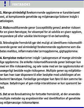 Det er blevet tiltagende klart, at genetiske faktorer spiller en betydelig rolle for individers forskellige risiko for at udvikle en række almindeligt forekommende sygdomme som type 1- og 2-diabetes mellitus, bipolære sygdomme, hjertekarsygdomme, forhøjet blodtryk, reumatologiske sygdomme med videre [1, 2].