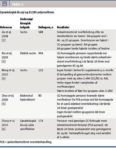 I denne artikel vil vi beskrive, hvordan genetisk polymorfisme i µ-opioidreceptor-genet i flere undersøgelser synes at have haft en betydning for effekten af postoperativ smertebehandling med opioider hos patienter, der har gennemgået gynækologisk kirurgi eller abdominalkirurgi.